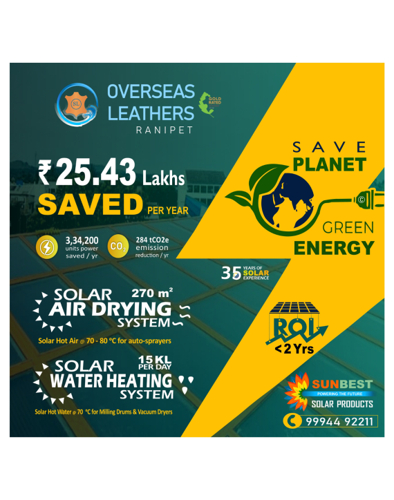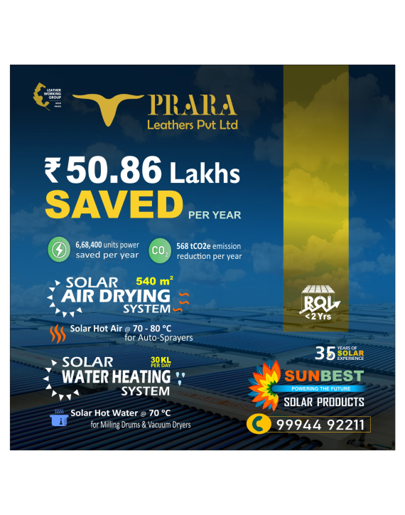 Prara Leathers Pvt. Ltd, RanipetSunBest Solar's air and water heating systems at our factory since 2023 has significantly cut energy costs, delivering efficient hot air and water for our processes. We are so convinced with the system's reliability as well as by the prompt after sales service to minor issues, that we are on the process of installing our 3 Solar Project - a 315sq.m Solar Air Dryer at present. I highly recommend SunBest's eco-friendly solutions, having already done to our industrial partners.